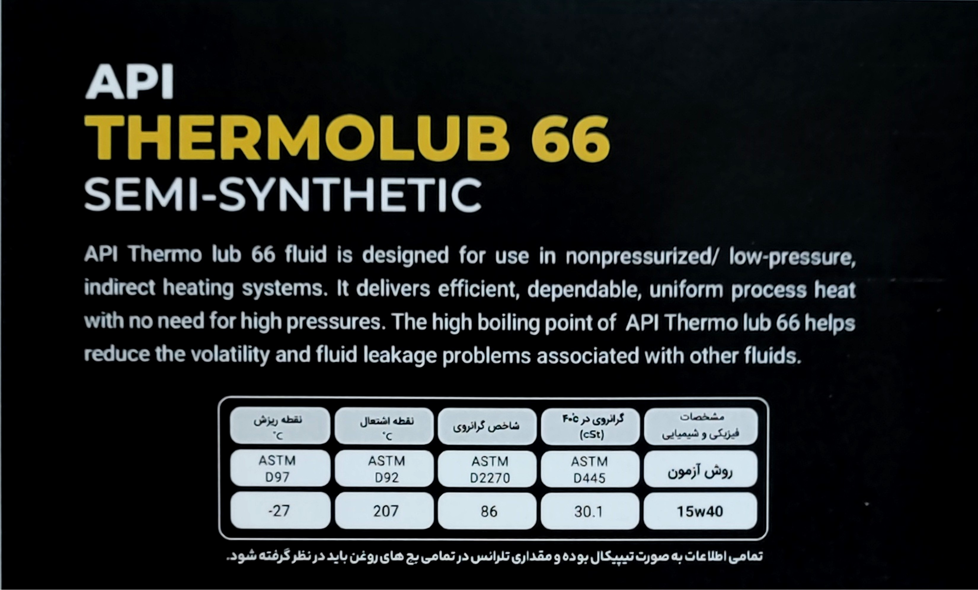 اگر به دنبال روغن حرارتی قابلاعتماد، باکیفیت، پایدار و ایمن برای سیستمهای گرمایشی صنعتی هستید، Termolub 66 انتخابی هوشمندانه است.